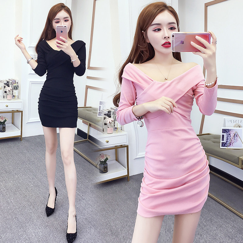 韩国秋冬修身长袖交叉v领露肩一字领连衣裙紧身褶皱...