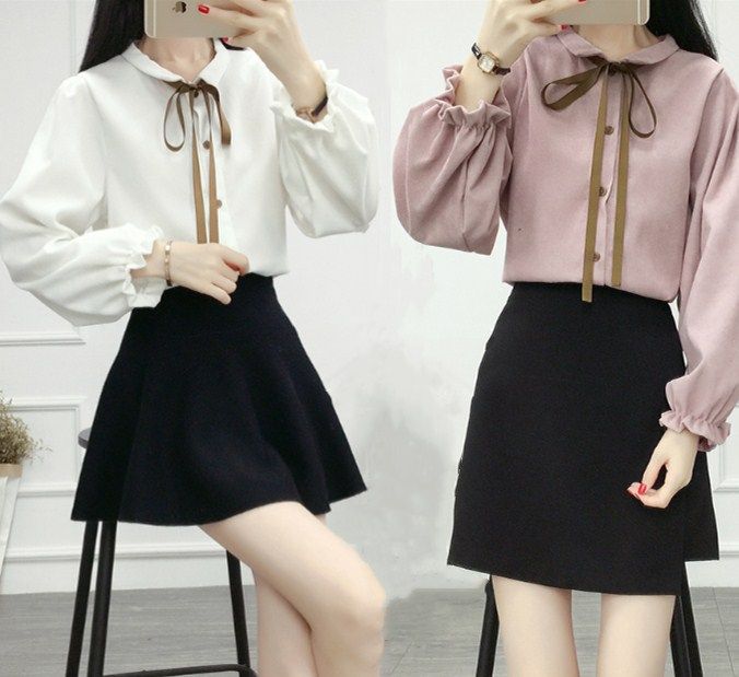 加绒衬衫女长袖秋冬季2019新款韩版蝴蝶结系带加厚...