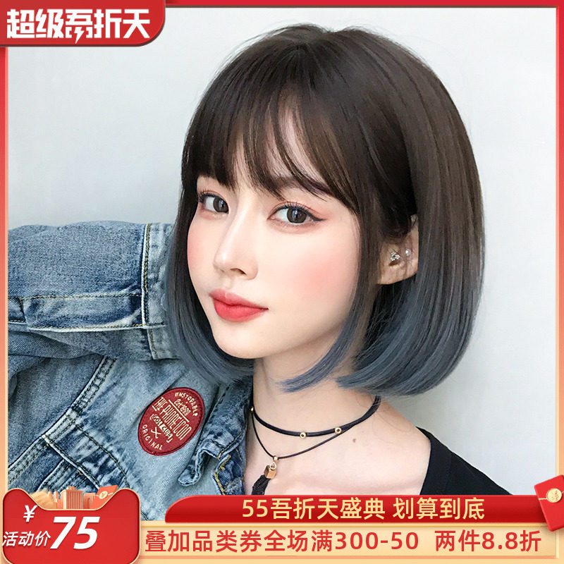 假发女短发学生头圆脸渐变雾霾蓝全头套式网红自然...