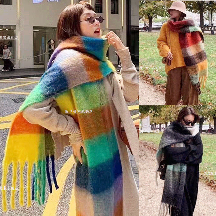 现货acne羊毛羊绒围巾彩虹色方格子双面披肩明星同...