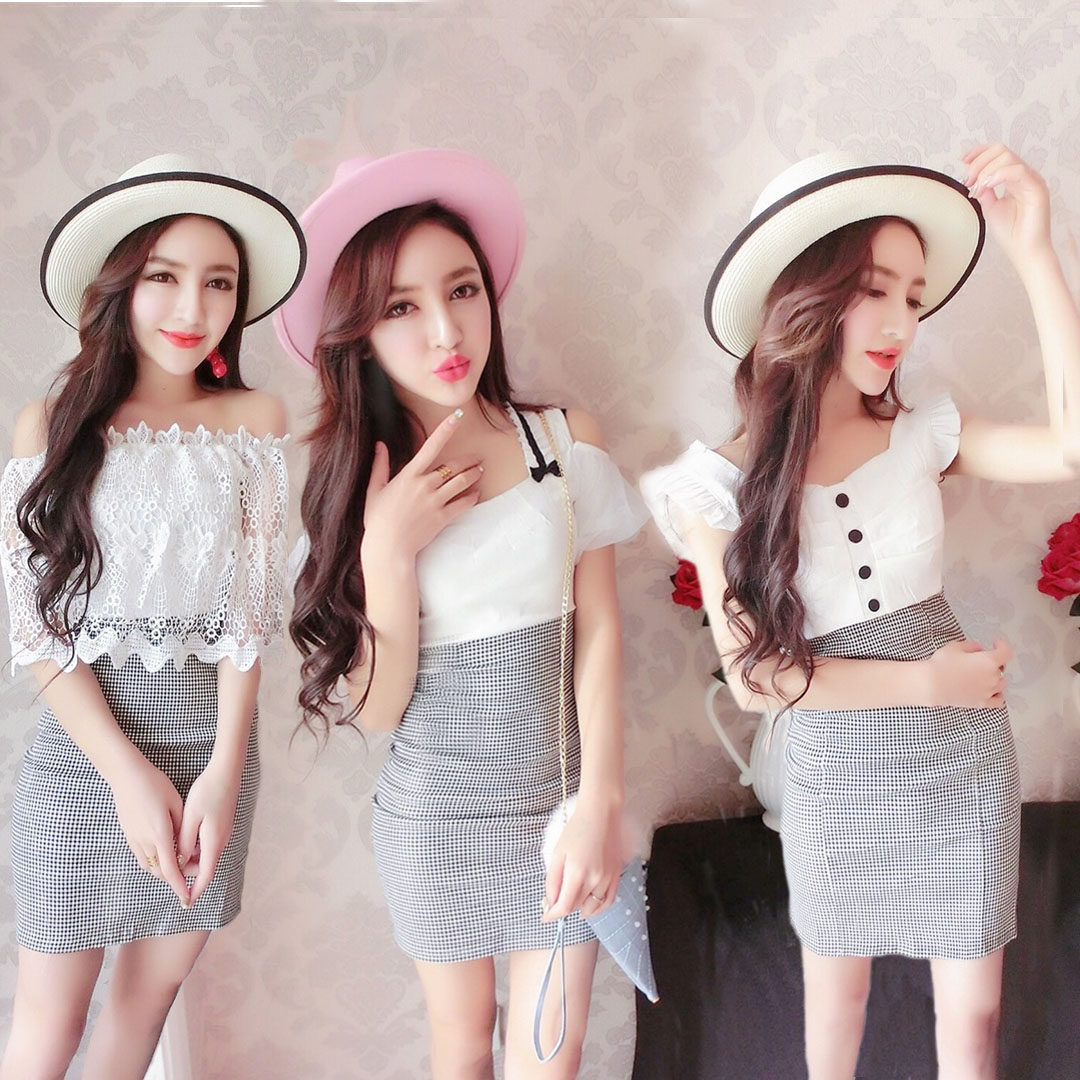 2019夏季新款韩版名媛一字领露肩蕾丝花边撞色修身...