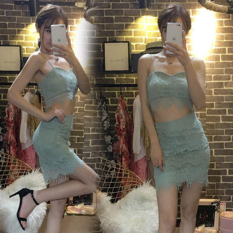2019欧洲站夏季新款时尚睫毛蕾丝性感吊带露腰两件...