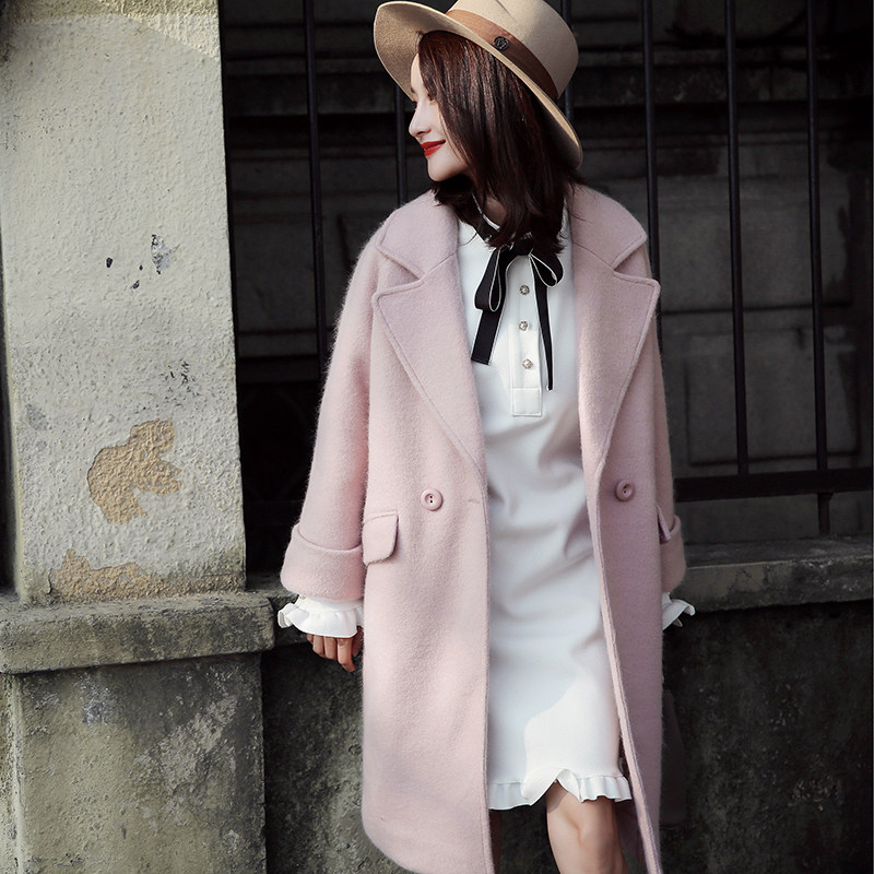 冬季浅粉色马海毛双排扣呢子外套韩版宽松显瘦中长...