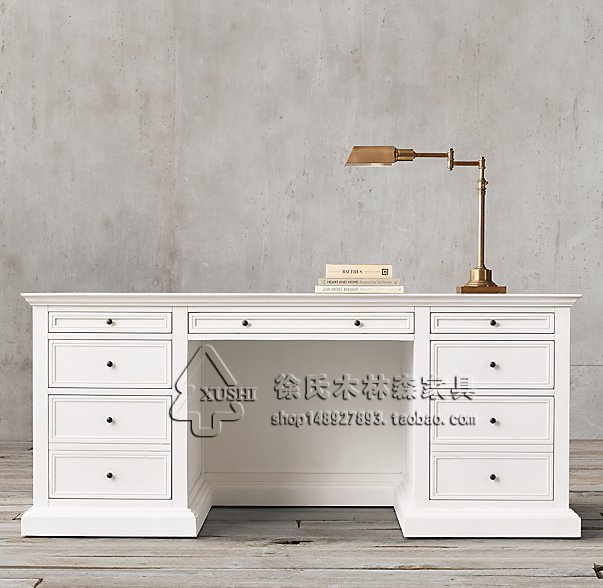 美式乡村实木书桌电脑桌法式白色写字台办公桌多抽...