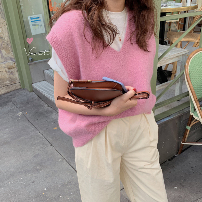 春秋新款韩版学院风百搭粉色套头宽松毛衣马甲v领针...
