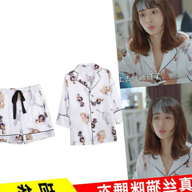 小时光司徒末同款猫咪印花睡衣2019新款夏真丝短裤...