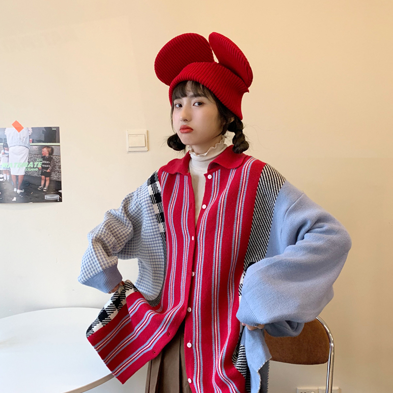 2019秋冬新款超火ins网红洋气拼色减龄开衫宽松中长...