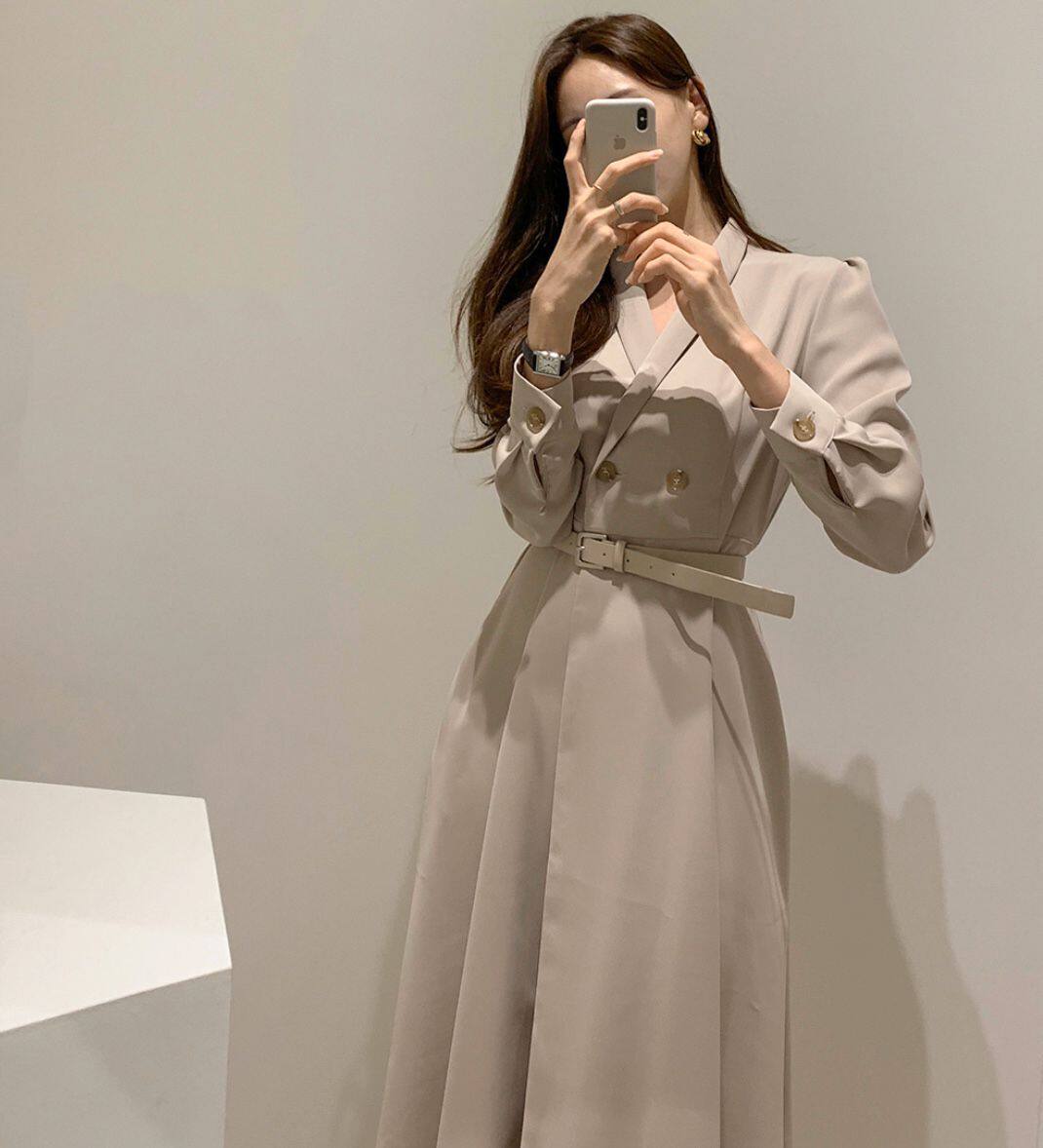 韩版chic气质西装领复古双排扣收腰显瘦大摆风衣外...