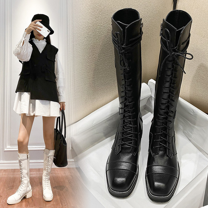 英伦风不过膝长靴女2019秋冬新款百搭受伤军靴系带...