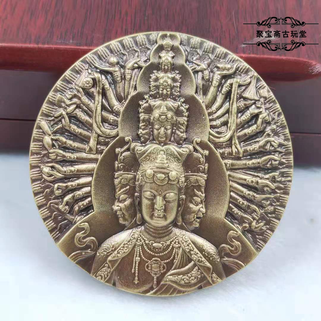 普陀山南海观音大士大铜章纪念章全铜三头千手观音...