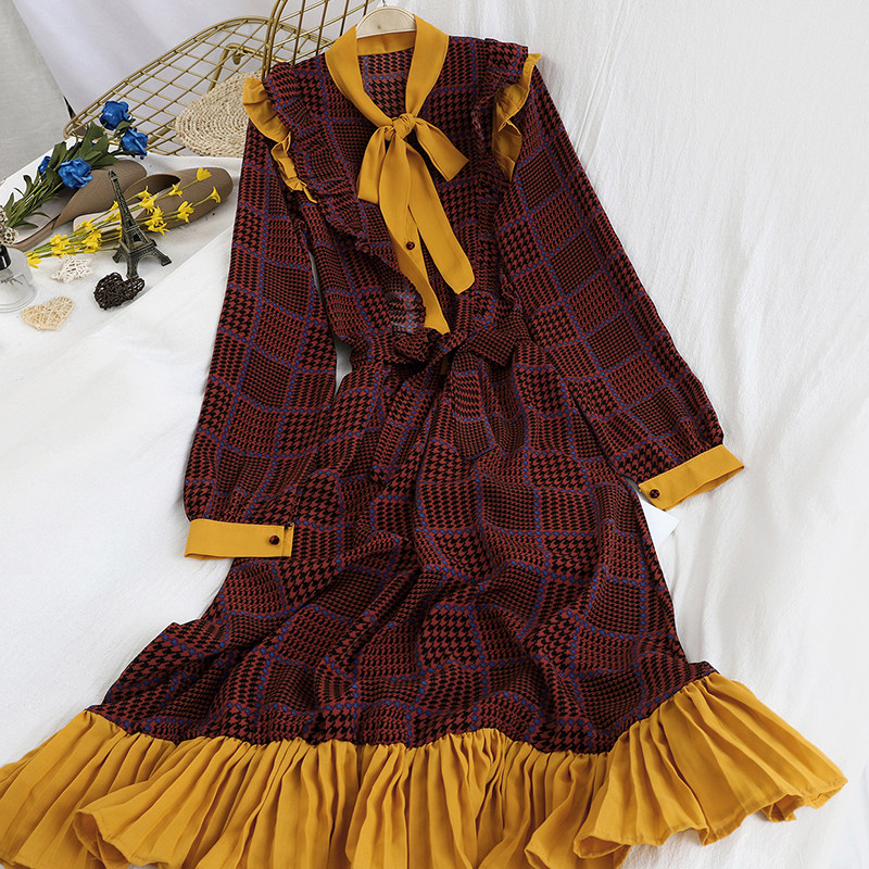 时尚撞色绑带立领木耳减龄连衣裙韩版文艺复古格纹...