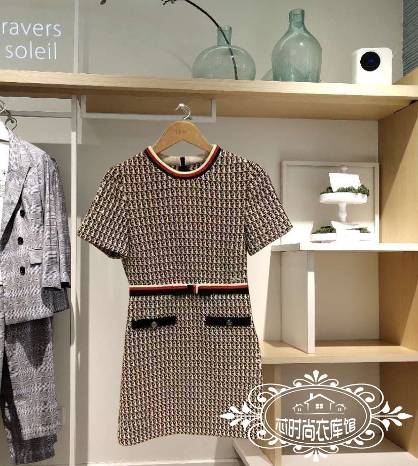 maje2020春夏新款显瘦修身撞色织带短袖小香风连衣...