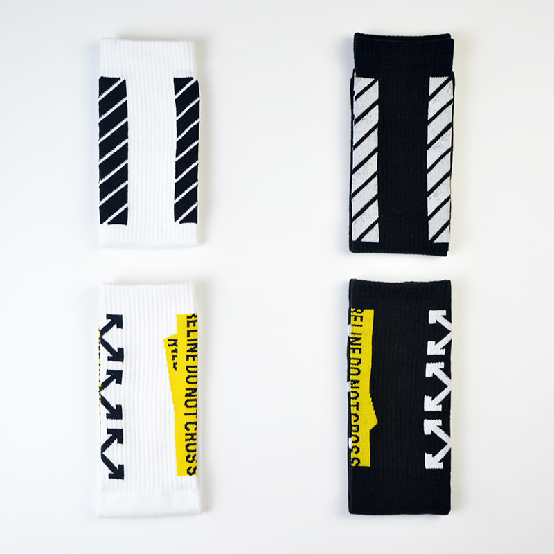 4双装off white袜子潮牌ow袜子长筒中筒黑白黄条纯...