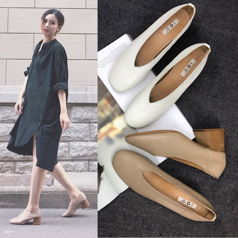 复古奶奶鞋女粗跟真皮V口2020春新款百搭中跟单鞋软...