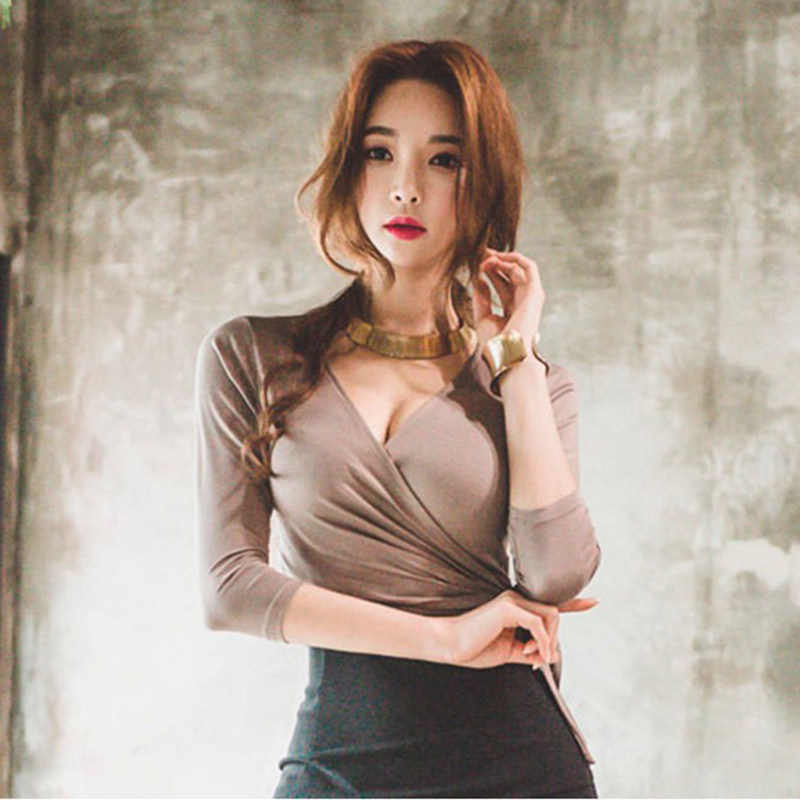 2019秋冬夜店性感女装长袖深V领低胸蕾丝拼接镂空包...