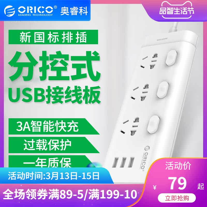 ORICO usb快充插线板 智能插排独立开关排插座家用...