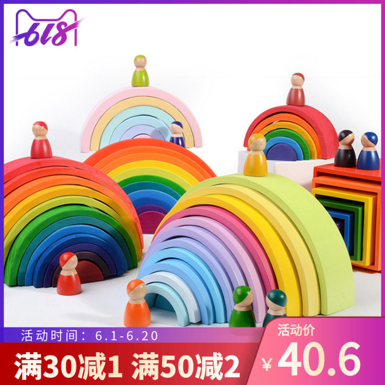 德国榉木儿童蒙氏早教彩虹积木12色原木隧道拼装木...