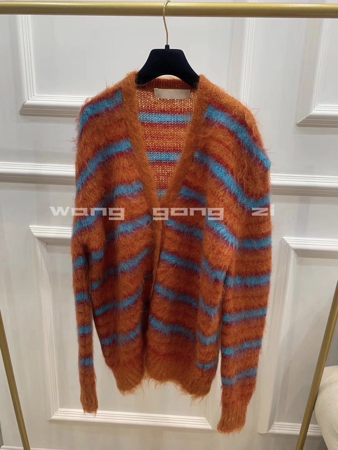 高品质 V领长绒高比例马海马橘色拼蓝条纹毛衣开衫外套