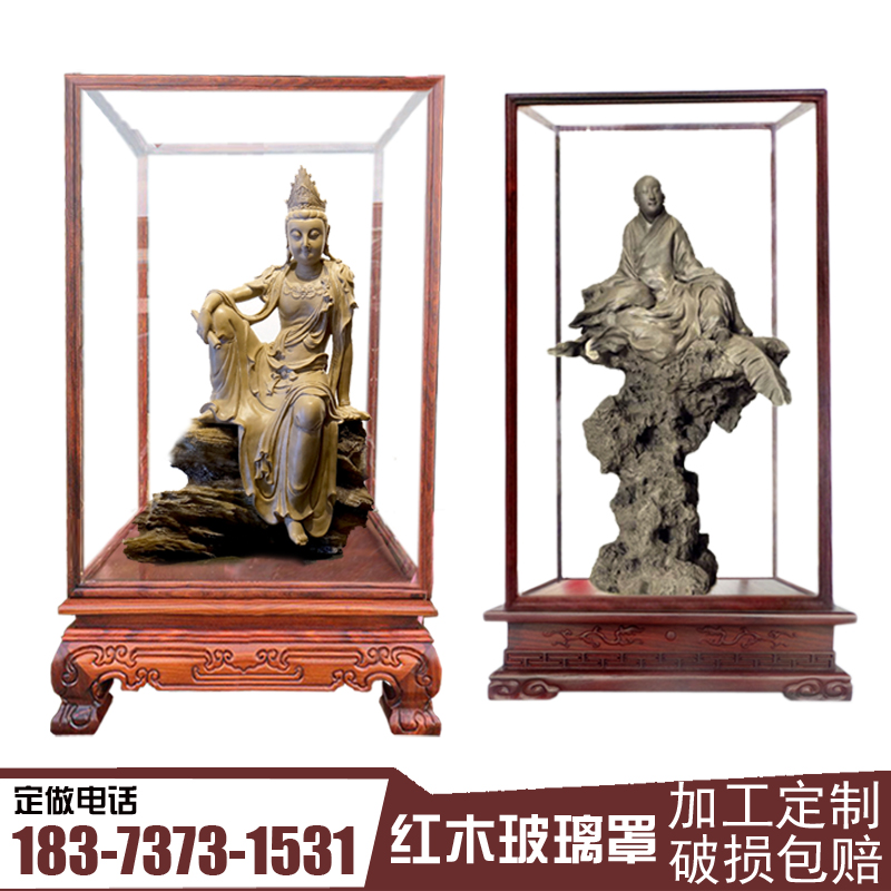 工艺品玻璃罩摆件红檀木防尘罩玉石黄金底座透明雕...