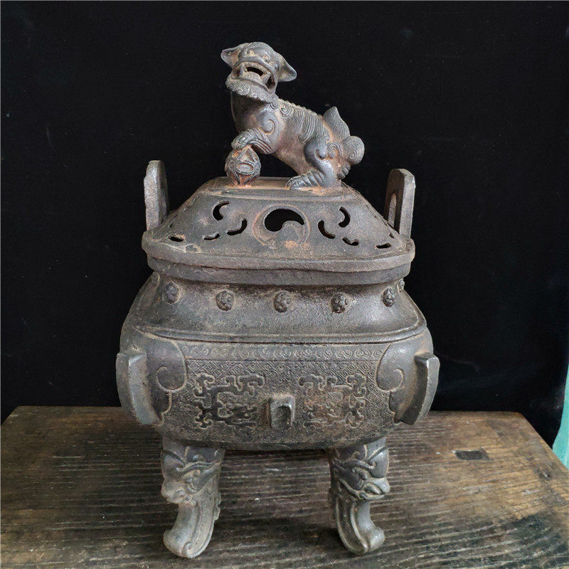 古董古玩 热卖收藏 老铁器四方狮子盖香熏炉雅居茶...
