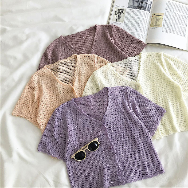 夏季2020新款韩版甜美少女减龄短款镂空V领花边排扣...
