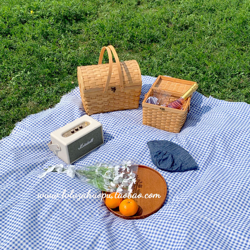 旅侣 韩国ins棉麻蓝色格子桌布野餐布摆拍背景布盖...