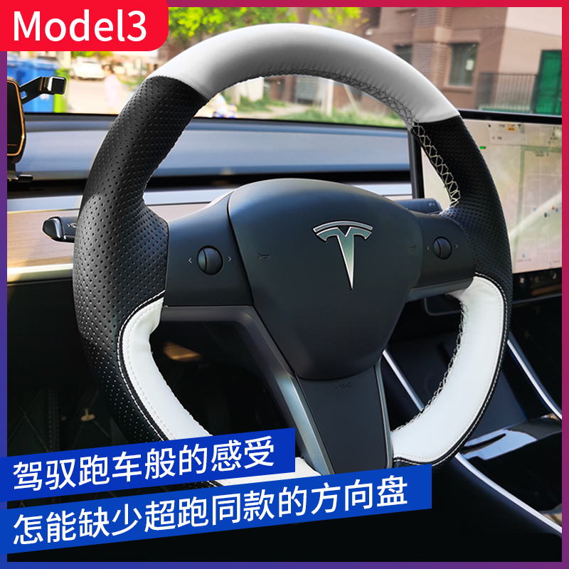 Tesla特斯拉Model3手缝方向盘进口真皮翻毛材质黑白...