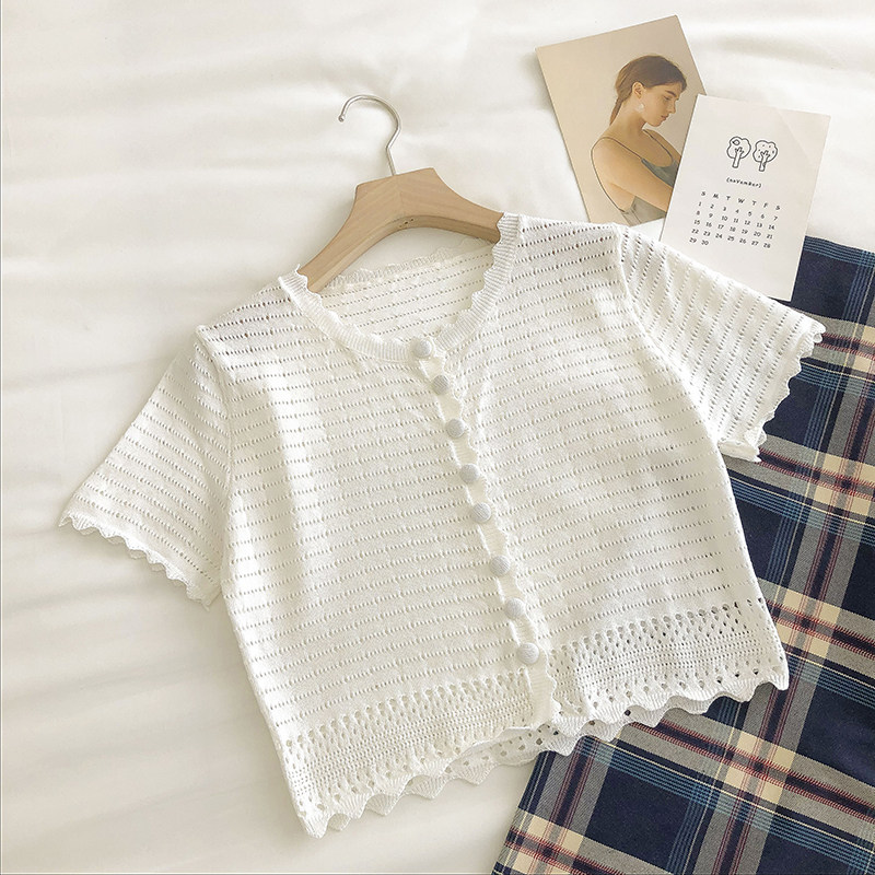 夏季2020新款韩版甜美镂空针织短款开衫女花边圆领...