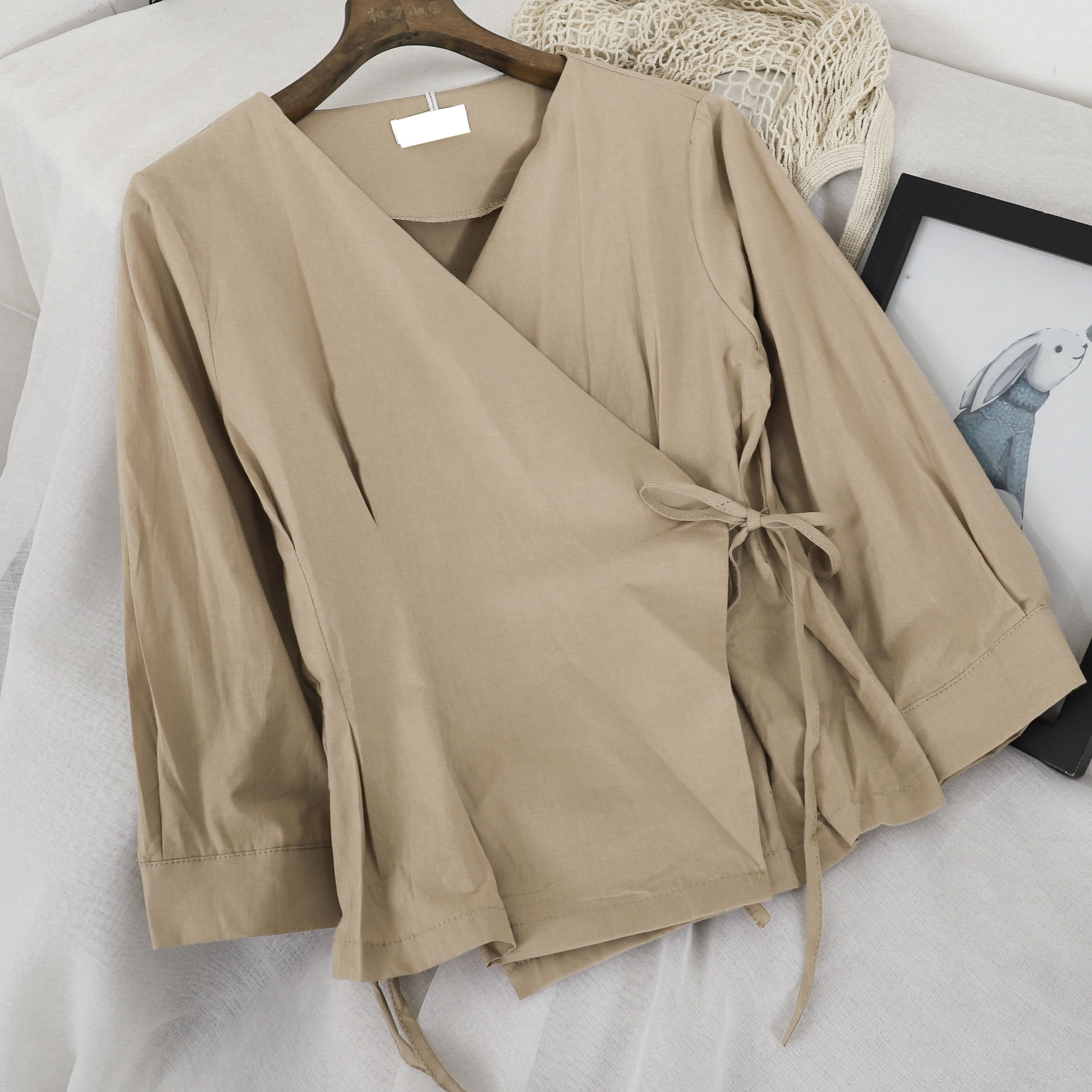 C624纯色系带蝴蝶结束腰修身上衣2019秋季新款七分...