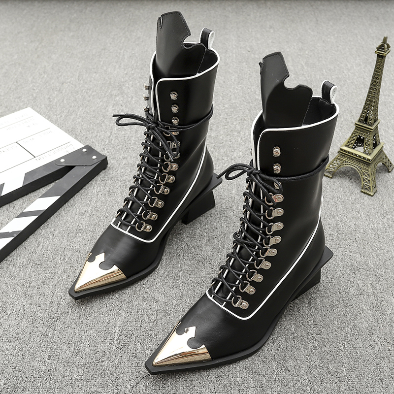 欧洲站2019秋冬尖头马丁靴真皮高跟鞋系带时装靴气...
