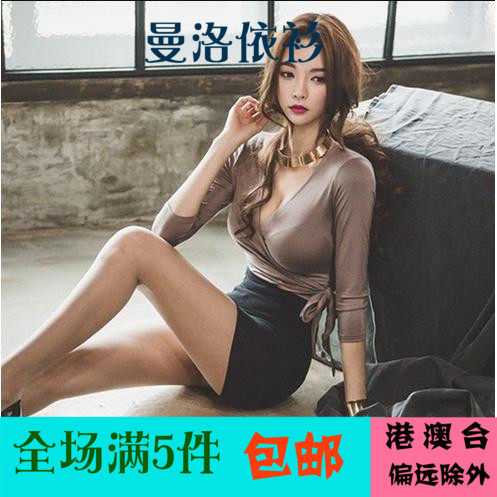 2018秋冬打底裙夜店深V领系带性感低胸女气质长袖包...