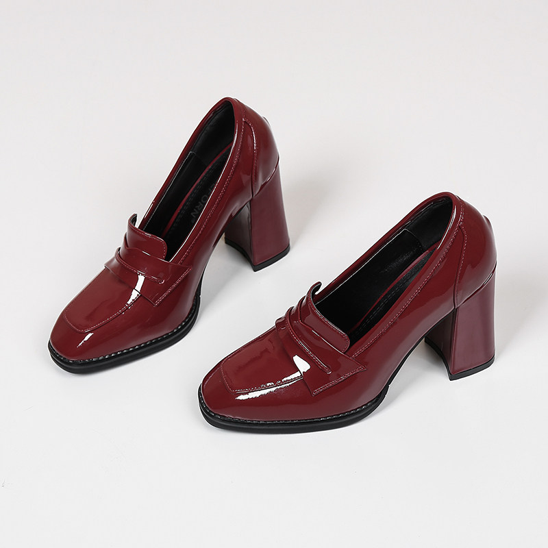 英伦风牛漆皮小皮鞋女春夏秋季一脚蹬真皮粗跟高跟...