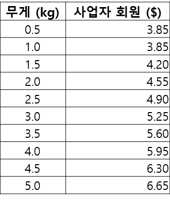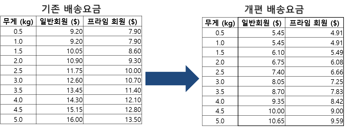 예시) 배송요금 1 Kg 기준 $9.2 => $5.45 ($3.75 인하)