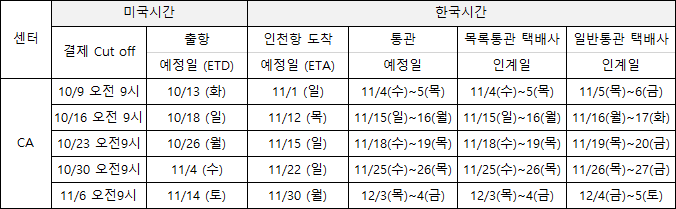 오마이집 CA 센터 해상운송 스케줄입니다.