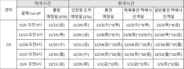 1. Cut off 이전에 결제를 하셨더라도 물량 및 기타 사정에 의해 다음 해상 일정으로 출고될 수 있습니다.