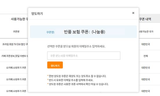 (3) [마이페이지>나의 쿠폰 함] 에서 [사용 가능한 쿠폰 > 반품 보험 무료 쿠폰 (나눔쿠폰)] 에서 '양도 가능' 버튼 클릭 후,