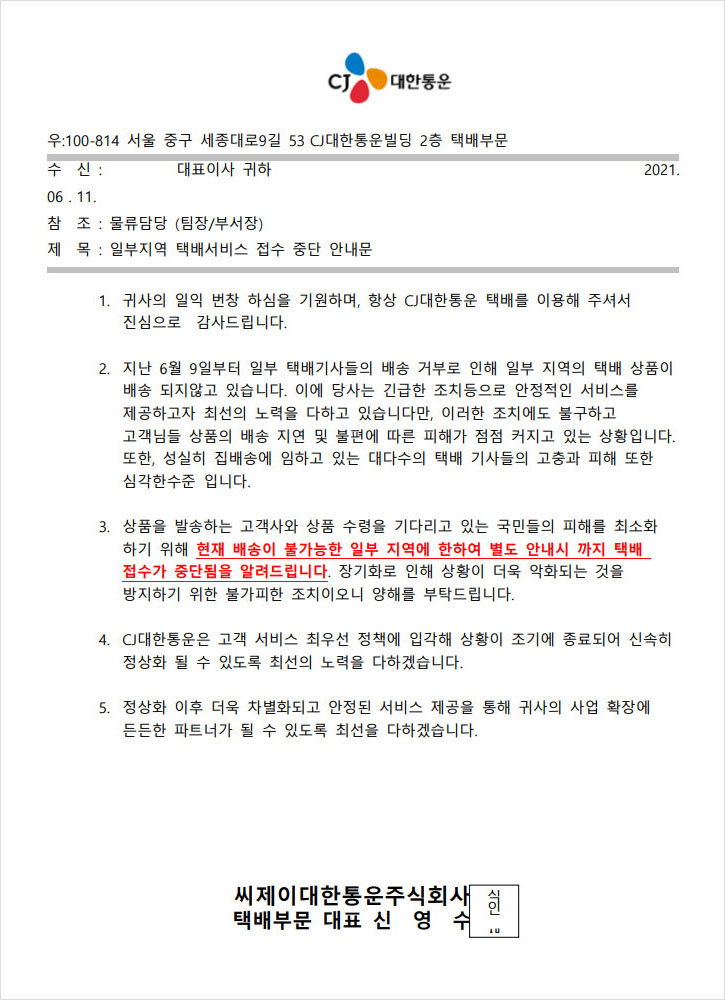 국내 택배사 파업으로 인해 CJ 대한통운 배송지역 중 일부 지역의 배송이 중단되었습니다.